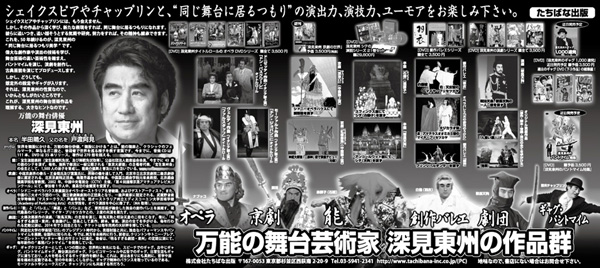 本名 半田晴久 又の名を 戸渡阿見 世界を猿股にかける、万能の舞台俳優。“猿股にかける”とは、能の猿楽と、クラシックのフェルマータ、単なるガニ股と、普段着で世界を巡る様子を表す言葉です。今までに、音楽CDは111本…